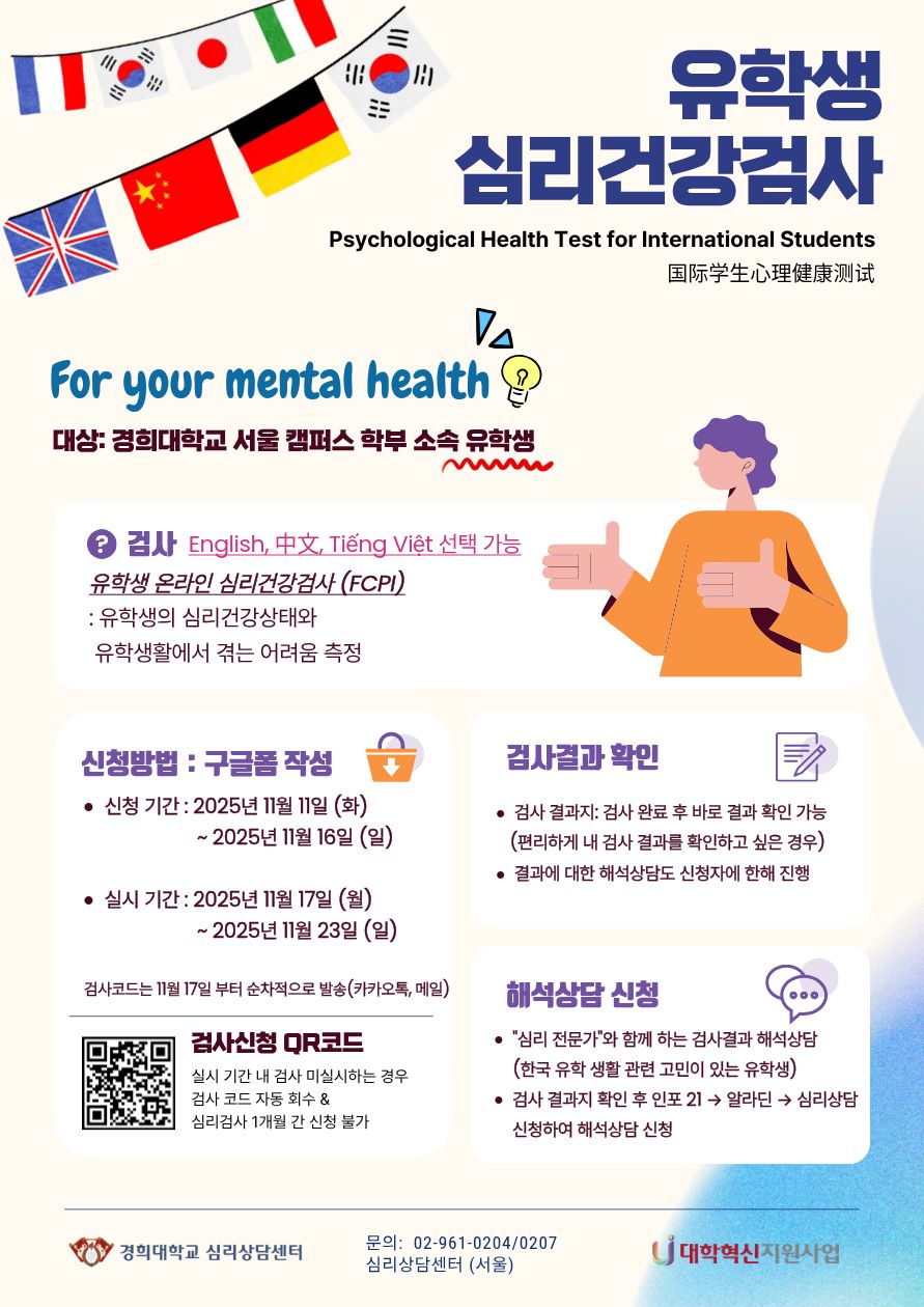 1. 대상: 경희대학교 서울 캠퍼스 학부 소속 유학생 2. 검사명 및 검사 내용 검사명: 유학생 온라인 심리건강검사(FCPI) 검사 내용: 유학생들의 심리건강상태와 유학생활에서 겪는 어려움 측정 3. 신청 및 검사 실시 신청 방법: 구글폼 작성 https://forms.gle/aUzGVrPnSpYfcDPf6 신청 기간: 2025년 11월 11일(화) ~ 2025년 11월 16일(일) 검사 코드 발송 기간: 2025년 11월 17일(월)부터 순차적으로 온라인 검사 코드 발송(카카오톡, 메일로 발송) 검사 실시 기간: 2025년 11월 17일(월) ~ 2025년 11월 23일(일) 실시 기간 내에 검사 실시를 하지 않는 경우, 검사 코드 자동 회수 & 심리검사 1개월 간 신청 불가 4. 검사 결과 확인 및 해석 1) 검사 결과지: 검사 완료 후 바로 결과 확인 가능 V 편리하게 내 검사 결과를 확인하고 싶은 경우 2) 검사 결과지 & "심리 전문가"와 함께 하는 해석상담 V 한국 유학 생활 관련 고민이 있는 유학생 < 해석상담 신청 방법 > 검사 결과지 확인 후 인포 21→알라딘→심리상담 신청하여 해석상담 신청 문의: 경희대학교 심리상담센터(서울) 02-961-0204/0207 |
