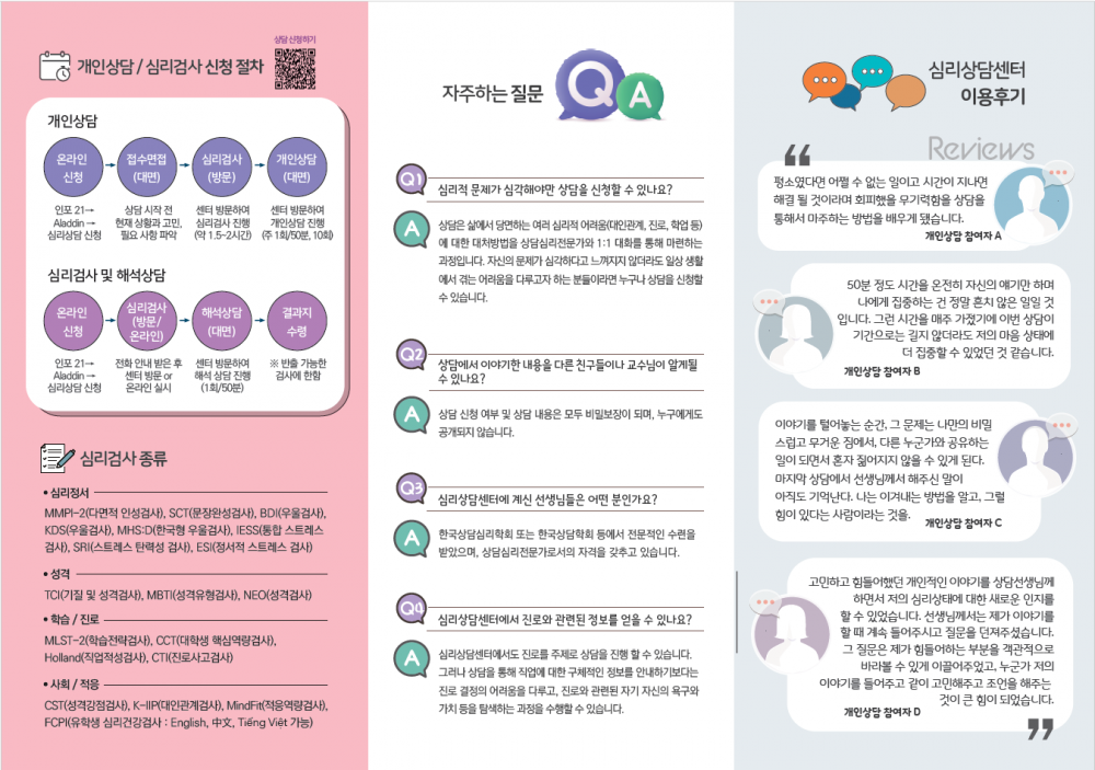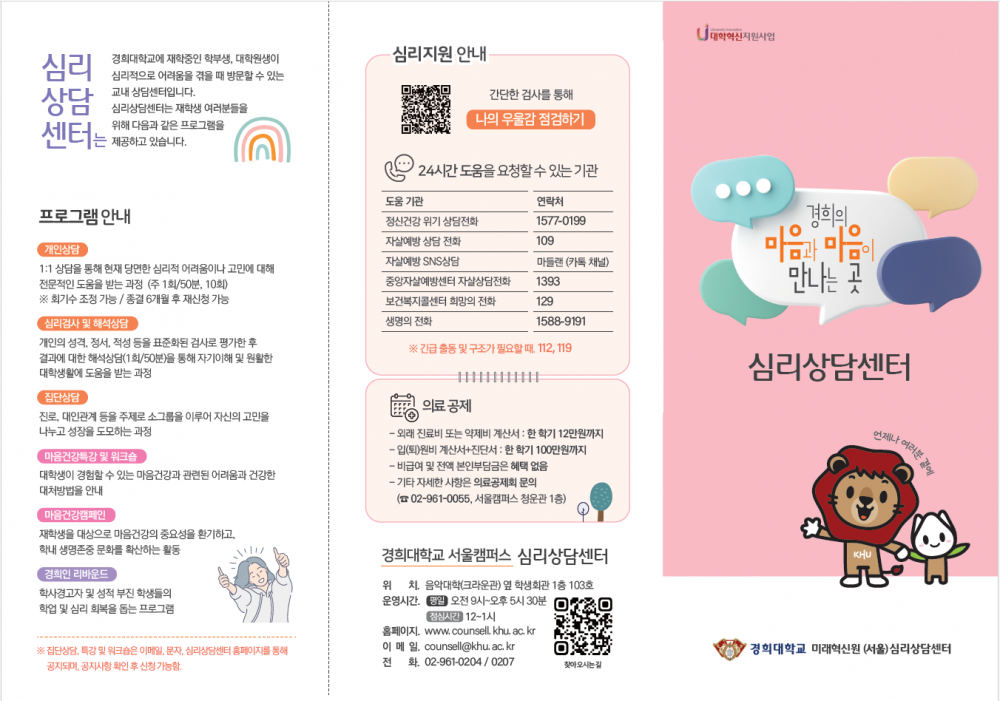 또한 단과대학 및 행정실에서 학생 대상으로 심리상담센터를 안내하실 때 리플릿 내용을 참고해 주시면 감사하겠습니다.